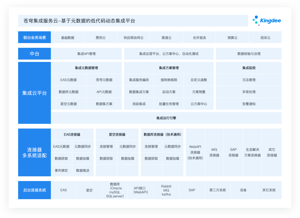 聚焦大型企業各類系統與金蝶云·蒼穹集成的需求, 采用元數據驅動的設計模式,通過低代碼可視化配置、豐富的值轉換規則和開放的對外服務能力,快速實現客戶的動態集成需求,讓集成開發簡單、執行過程可靠、問題風險可控。支持用戶自行擴展webAPI自定義型連接器,以滿足不同類型第三方系統的集成