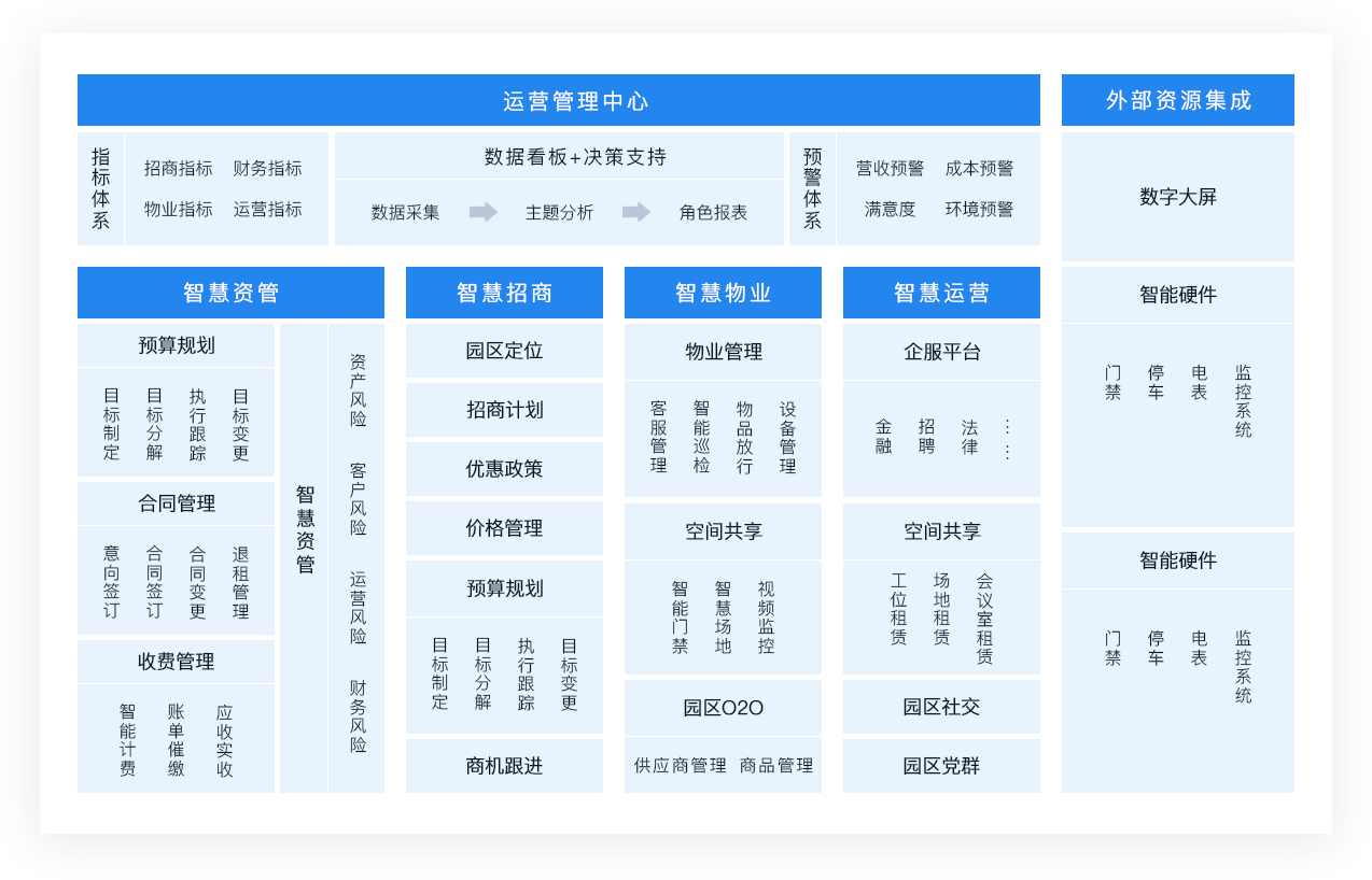 ?資產(chǎn)運(yùn)營(yíng)全流程管理,運(yùn)營(yíng)規(guī)劃、精準(zhǔn)招商、高效管理,讓資產(chǎn)釋放價(jià)值 從園區(qū)規(guī)劃定位,到招商計(jì)劃制定及執(zhí)行,借助信息化的手段實(shí)現(xiàn)裂變營(yíng)銷、精準(zhǔn)營(yíng)銷,幫助園區(qū)高效招商;通過園區(qū)資產(chǎn)全過程的管理,業(yè)財(cái)稅一體化融合,助力園區(qū)資產(chǎn)高效運(yùn)營(yíng)